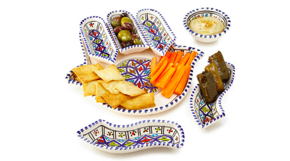 Help your friend serve up good times and delicious food for their Hanukkah party, housewarming or game day with this beautiful Hamsa-shaped serving set. Use the five removable sections for snacks and dips, and the tray is a good size for cheese or mezze spreads.